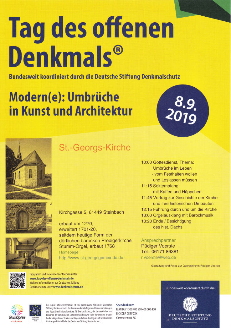 Auch die Finanzierung der Maßnahme steht – dank zahlreicher Spenden von Steinbacher Bürgerinnen und Bürgern und Unternehmen – auf festen Füßen. Der Kirchenvorstand der St. Georgsgemeinde dankt allen, die durch ihren Einsatz oder durch finanzielle Zuwendungen zum Gelingen dieses Projektes beigetragen haben.